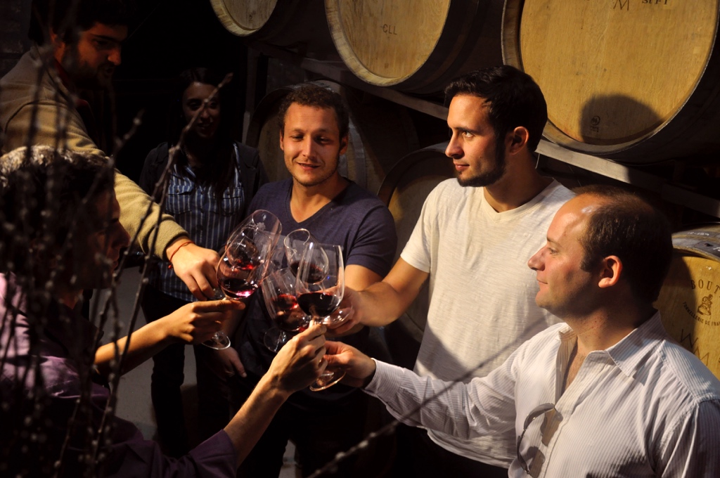 Brindando en la cava de Achaval Ferrer con mis ex compañeros de equipo